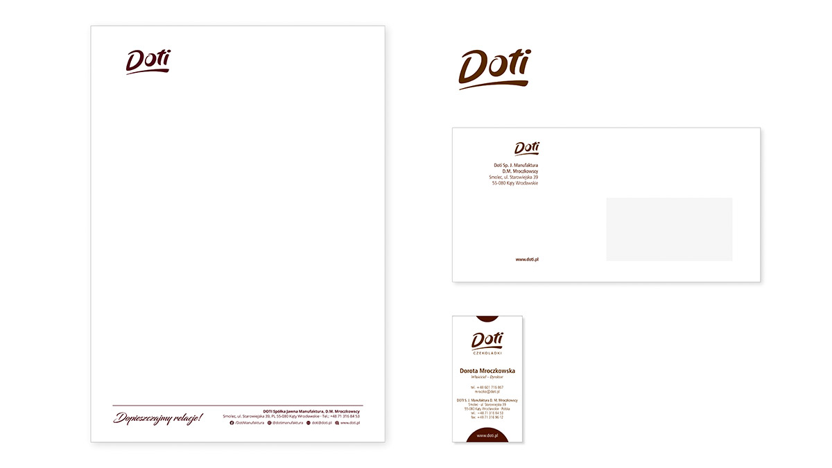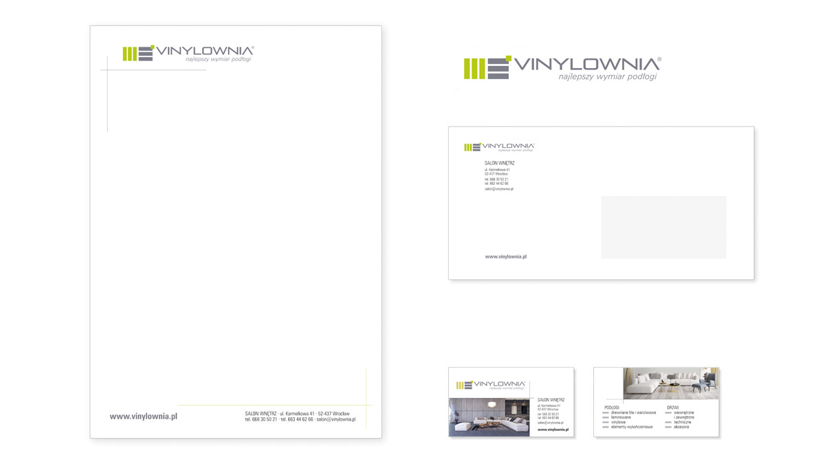 Następnie stworzylismy materiały do identyfikacji wizualnej - wizytówki, kopertę i papier firmowy.